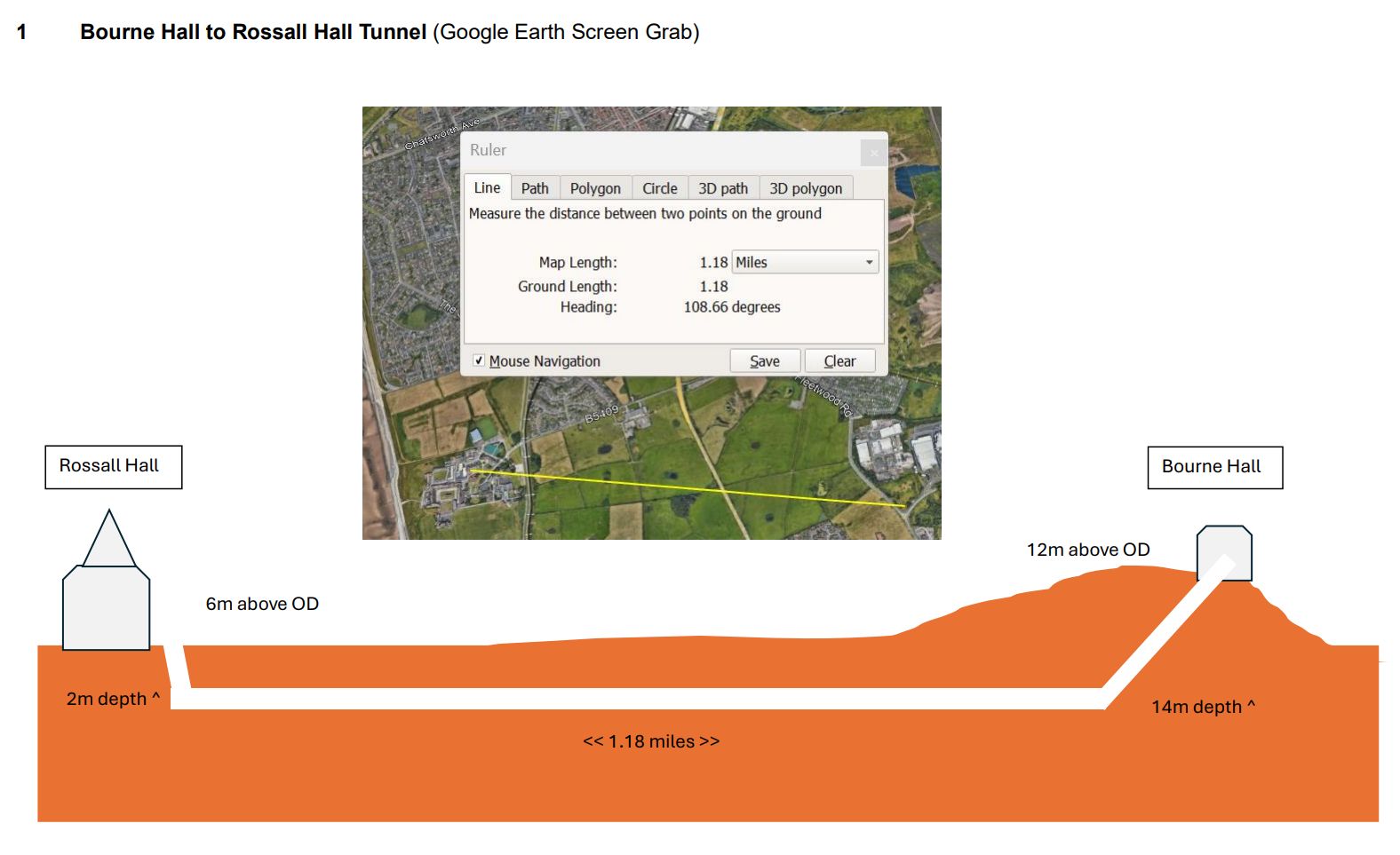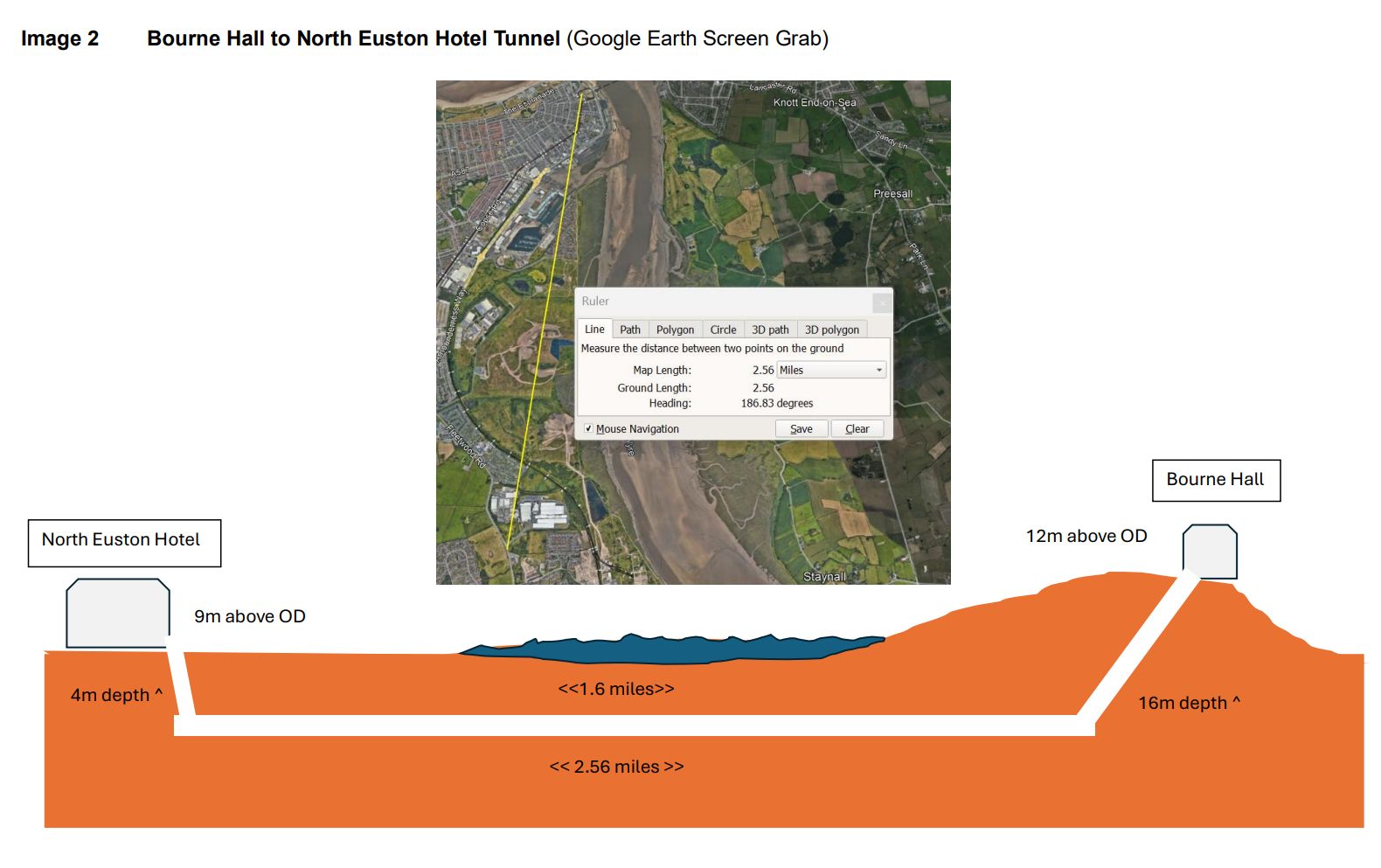 The site of Bourne Hall is around 8 metres (26 feet) above the sea-level plain towards Rossall (Hall), just over 1 mile away (see image 1). A tunnel from the hall would have had to be dug, by hand, to a depth of at least 10 metres (33 feet) through soft soil. It would have needed shoring all along its length to prevent collapse, needing a lot of wood (remember the film The Great Escape?), and, because of the distance, it would also have needed ventilation shafts to the surface at regular intervals along its length. The land around Bourne Hill was marshy, crossed by a few streams and susceptible to flooding which would have inundated any tunnel.