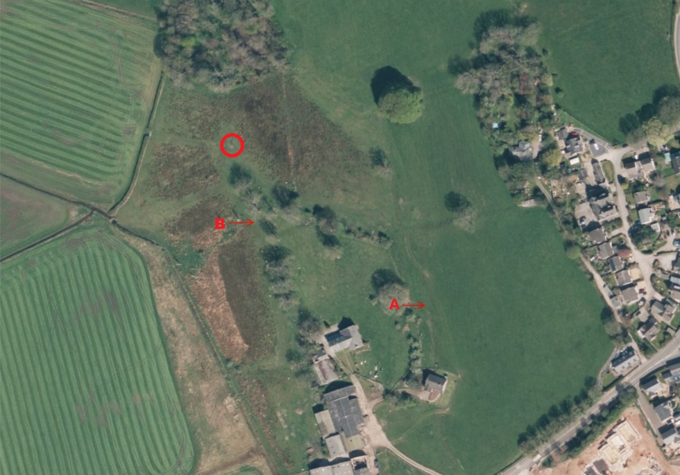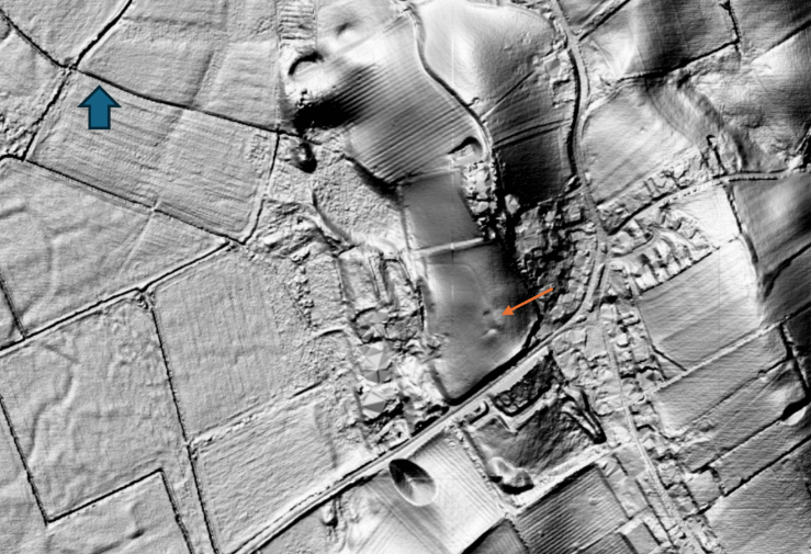 On first sight the lidar image looks slightly confusing but in a field above the hall, marked with the red arrow, an “out of place” rectangle appears. This would be the main focus of our investigation.