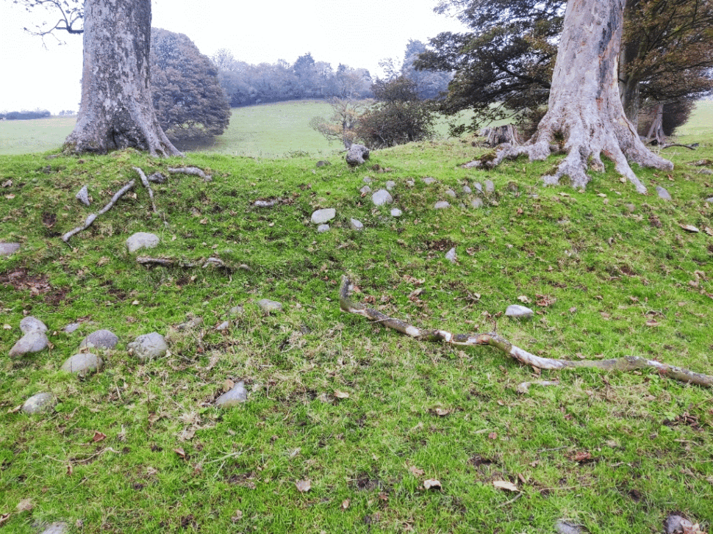 Again, worked stone demonstrated that this area had been developed some time ago. More worked stone (two pieces) were uncovered on the north of the site – well away from the Hall. As far as the blogger is concerned the most interesting find was partially uncovered “wall” between the swampy area and the open, reclaimed land. Marked with a large red “O” since the exact position on the map is inexact.