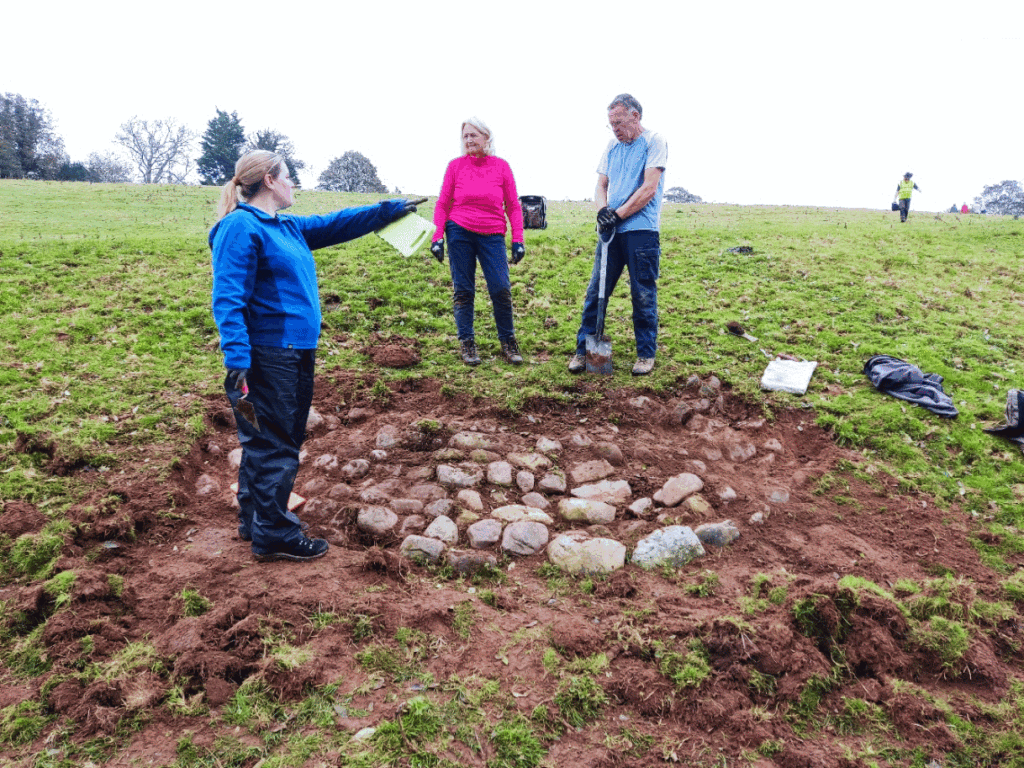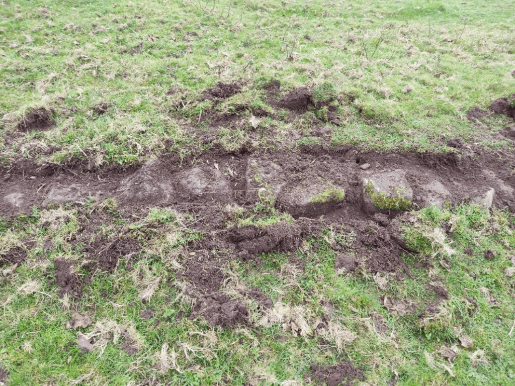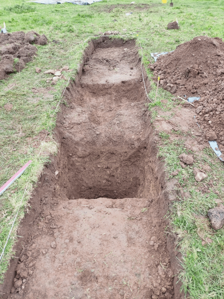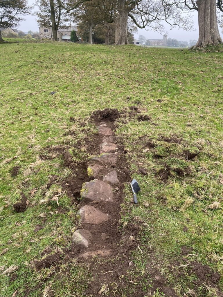 Some of the uncovered cobbles can be seen at the side of the trench.