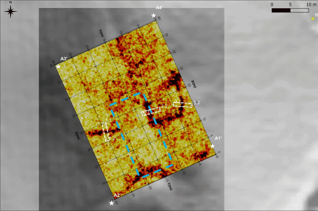 GPR was used to cover the site and the resulting image at 1.1m depth seems to reveal a discontinuity in a lateral feature. Three 5m trenches were opened. Almost immediately, within 20cm, all of the trenches encountered small cobbles.